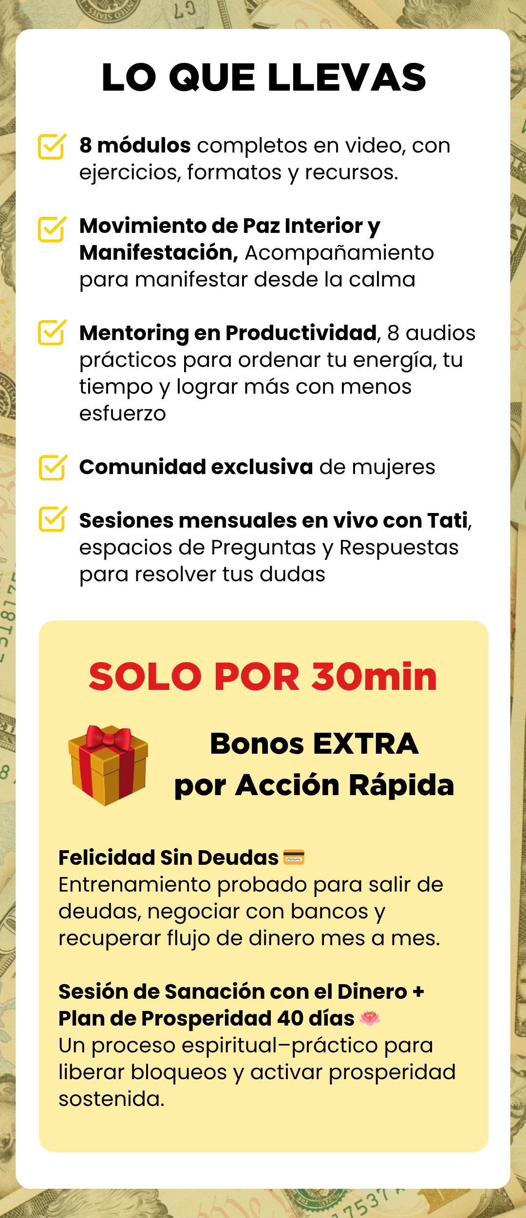 ✨ Acceso a una comunidad privada de personas que, como tú, han elegido transformar su relación con el dinero desde el amor y la conciencia.